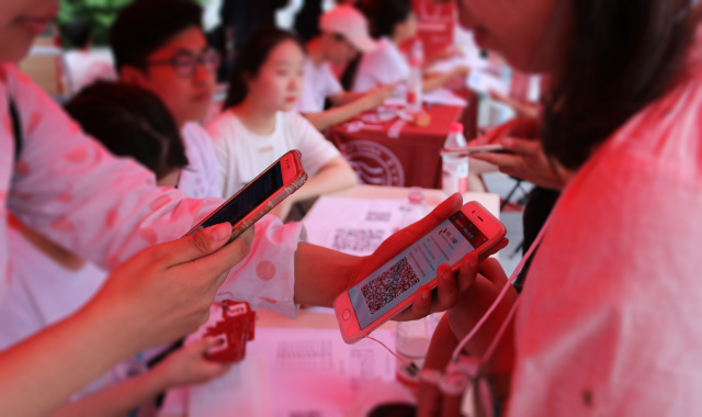 报到点的学生干部在帮助新同学使用电子passport完成注册