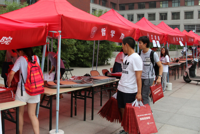 负责迎新工作的同学们将迎新物资从人文楼搬运至明德广场